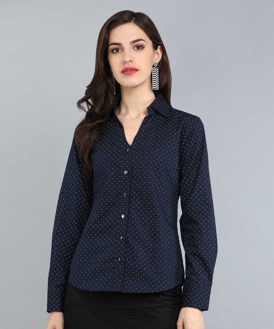 Embrace sophisticated style with this beautifully crafted navy blue shirt that perfectly balances professional polish with playful charm. The delicate white polka dot pattern adds visual interest while maintaining the refined aesthetic essential for workplace and formal occasions.