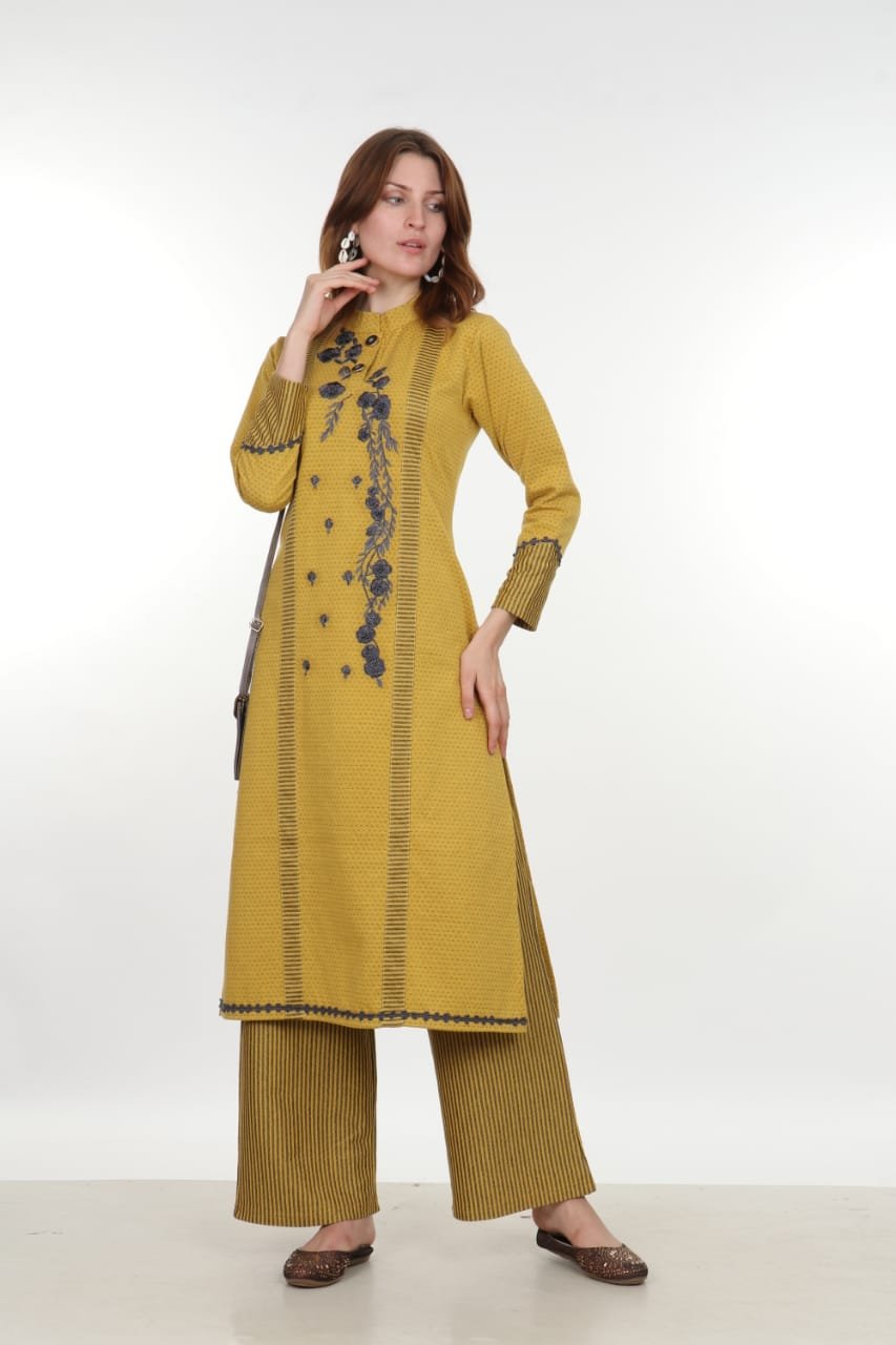 Embrace elegance with this stunning mustard yellow embroidered kurti set featuring intricate floral embroidery, ribbed detailing, and matching striped palazzo pants. Perfect for festive occasions, casual wear, and ethnic styling.