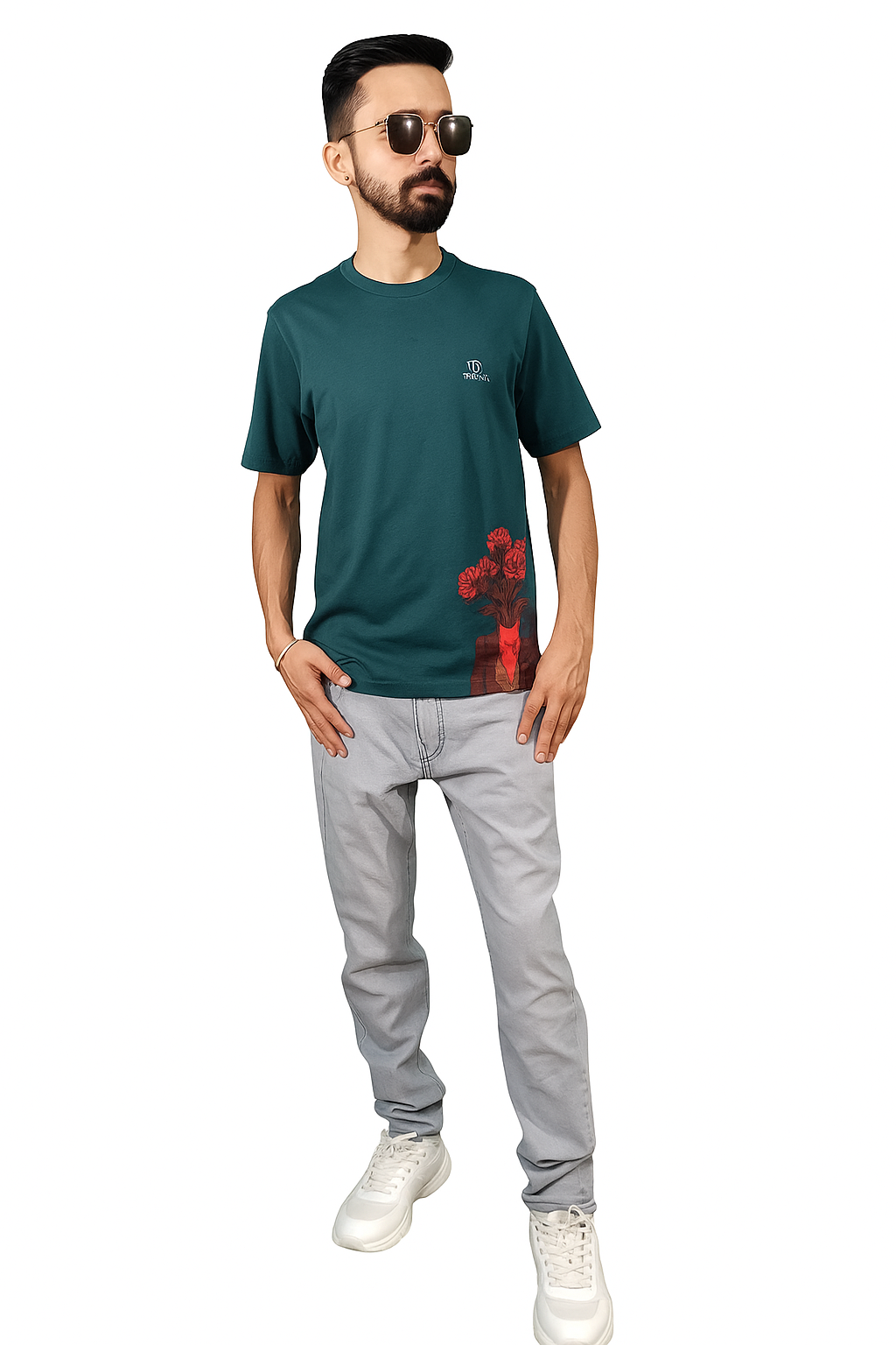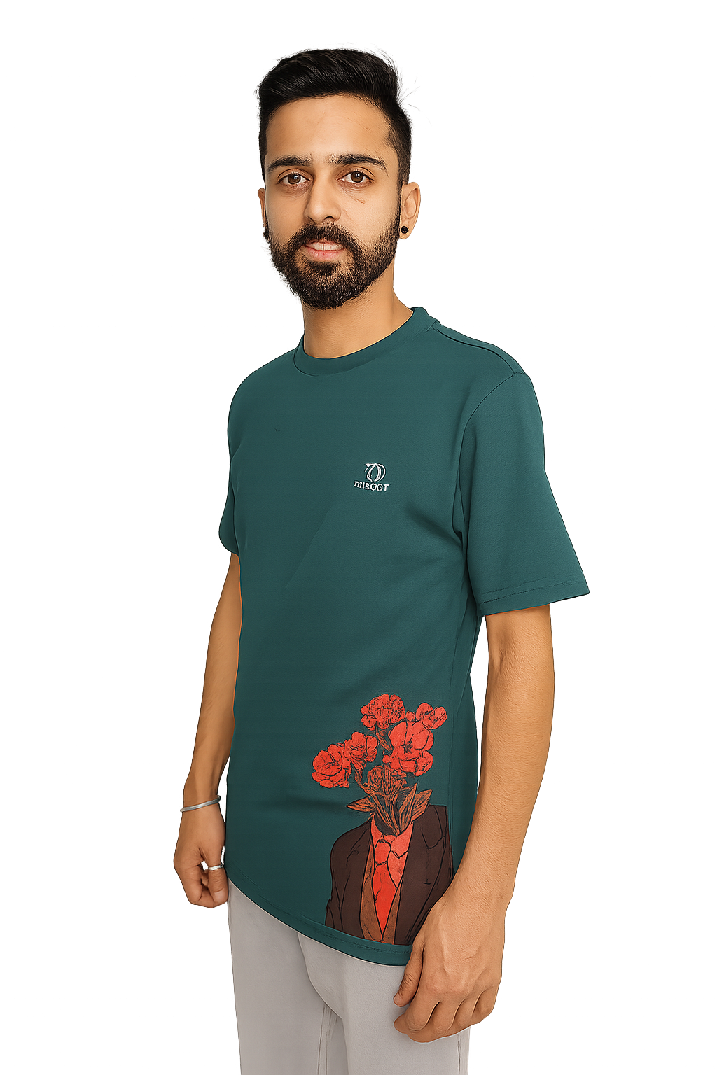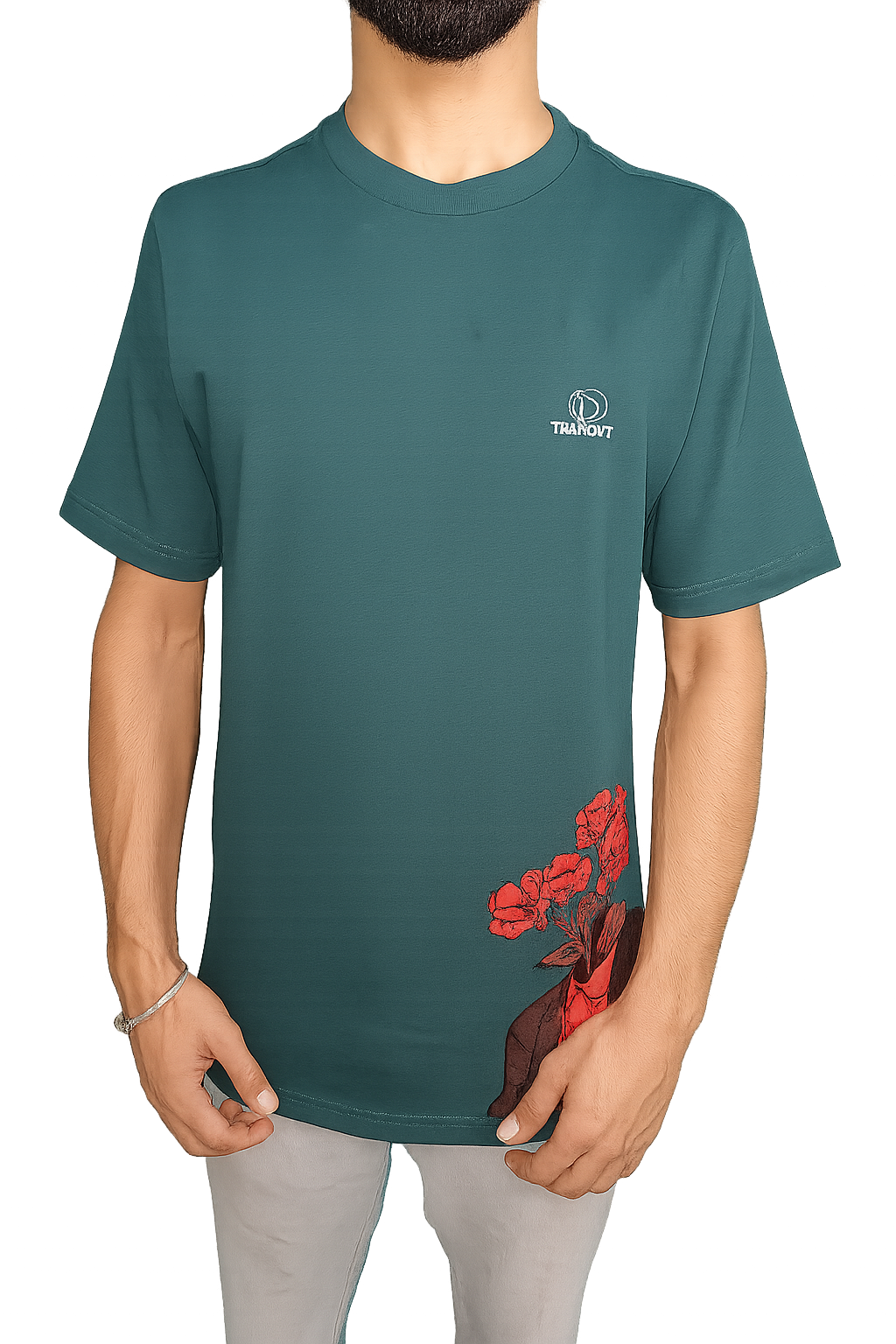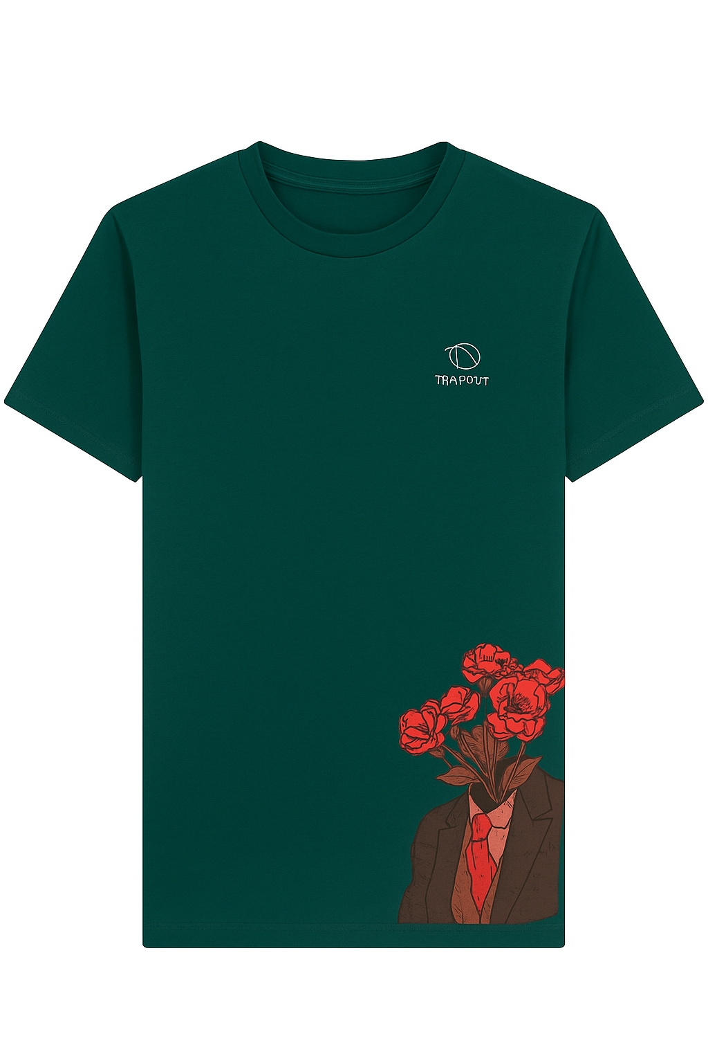 Eye-Catching Design Elements The standout feature of this graphic printed tee is the striking floral headless suit illustration positioned at the hem, creating a unique artistic statement that sets you apart from ordinary basics. The deep teal green base color provides the perfect canvas for the vivid placement print, while the distinctive Trapout logo on the left chest adds an authentic brand touch.