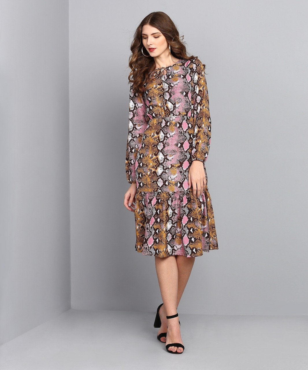 Embrace bold fashion with this stunning snake print midi dress that combines contemporary style with timeless elegance. This eye-catching women’s dress features a vibrant snake skin pattern in beautiful shades of pink, gold, brown, and cream that creates a luxurious and sophisticated look perfect for any special occasion.